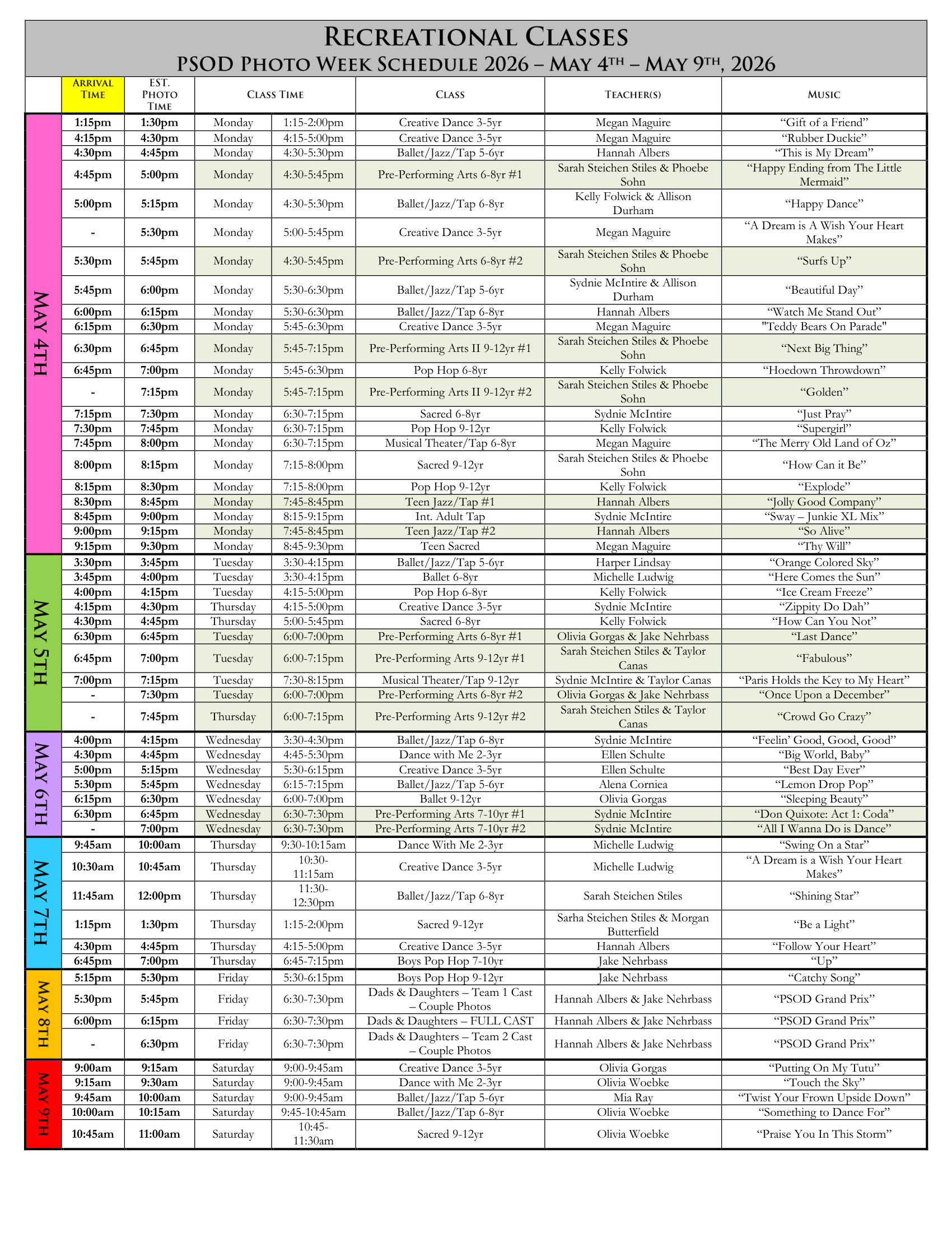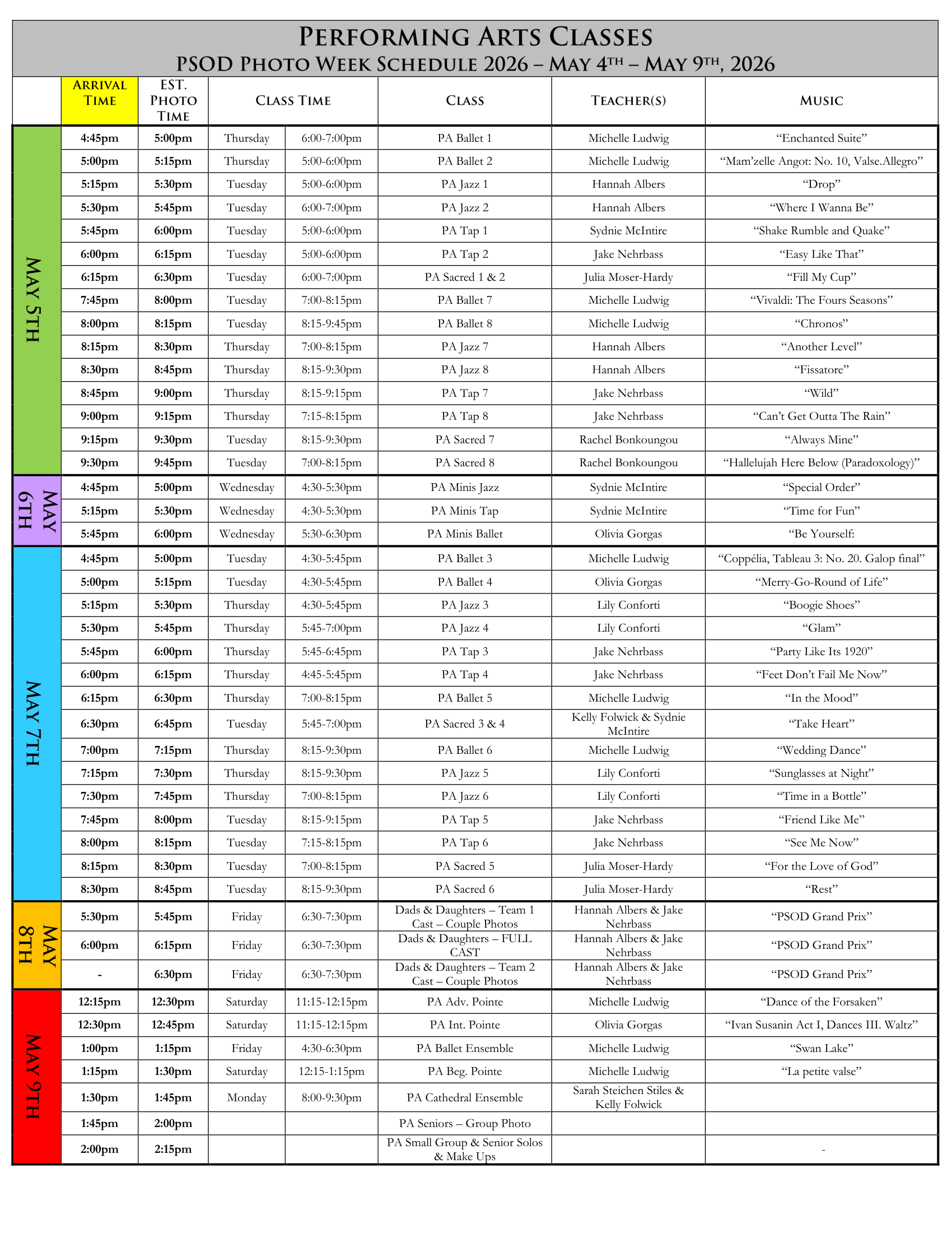 PA Pointe & PA Ballet Ensemble photos will be captured on Saturday, May 9th. (PA Beg. Pointe should wear their pointe leotards, pink tights and will receive a black ballet wrap skirt from PSOD.) PA Ballet Ensemble will have regular class on Friday, May 8th.